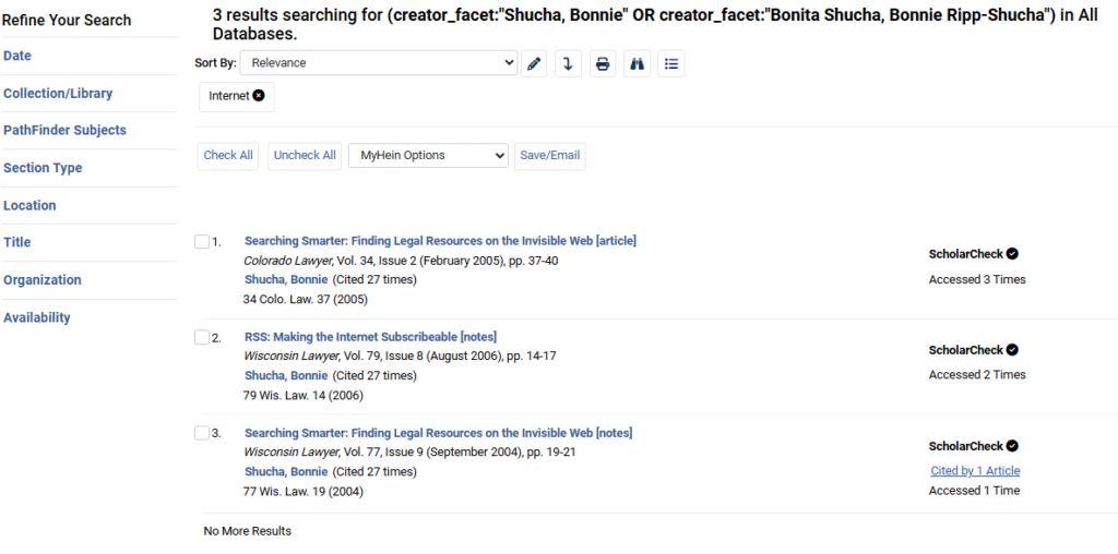 Next, users will notice that each subject is hyperlinked in blue. Click on any of the listed subjects. This will automatically perform a query across all subscribed databases looking for works by Bonnie Shucha related to that subject. For example, select Internet to view all available works by Bonnie Shucha on the subject.